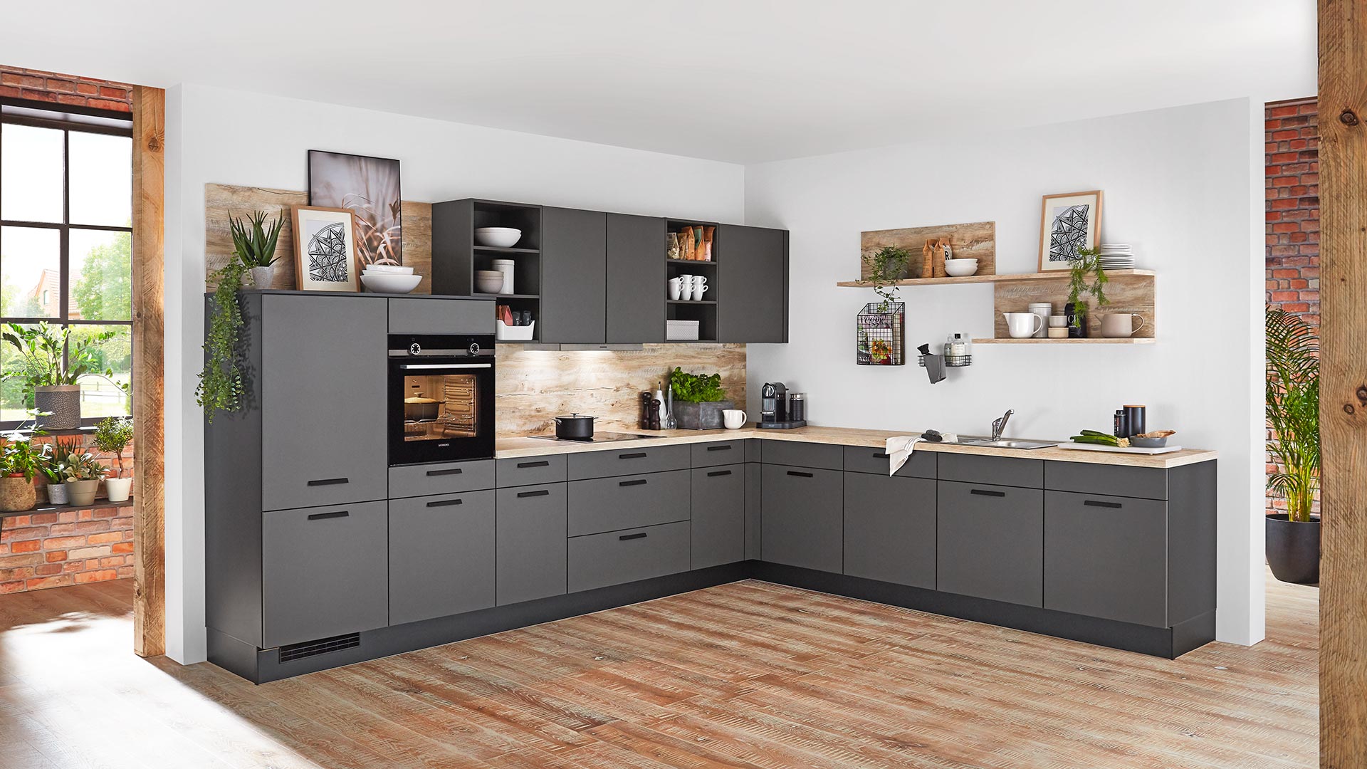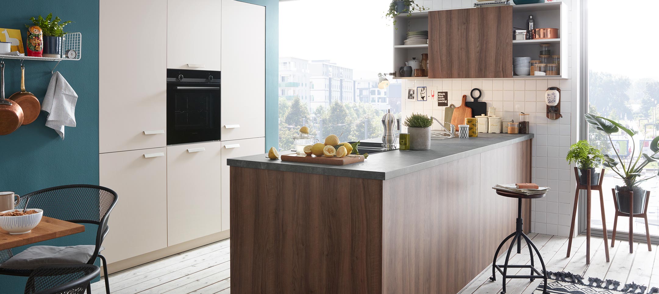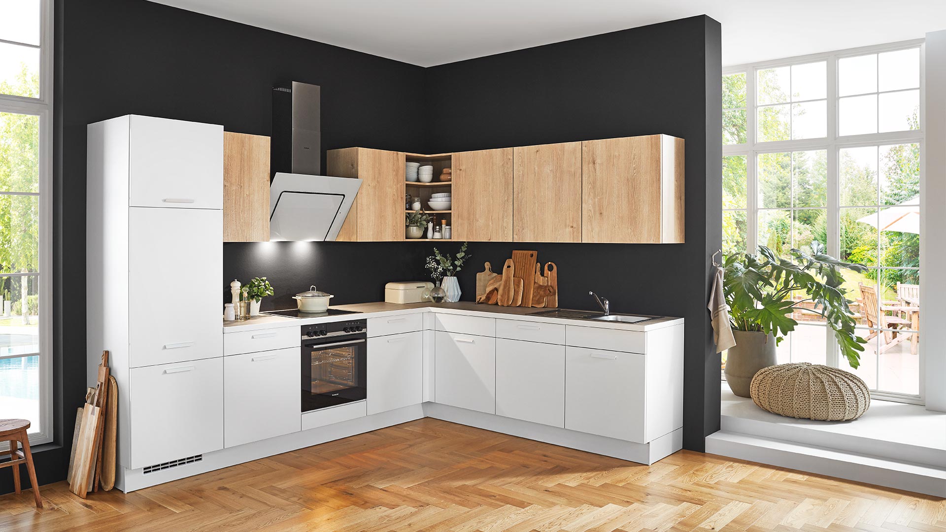 Die Arbeitsplatte in Naturholz-Optik bildet einen angenehmen und dezenten Kontrast und verleiht dieser Küche eine gediegene Eleganz.