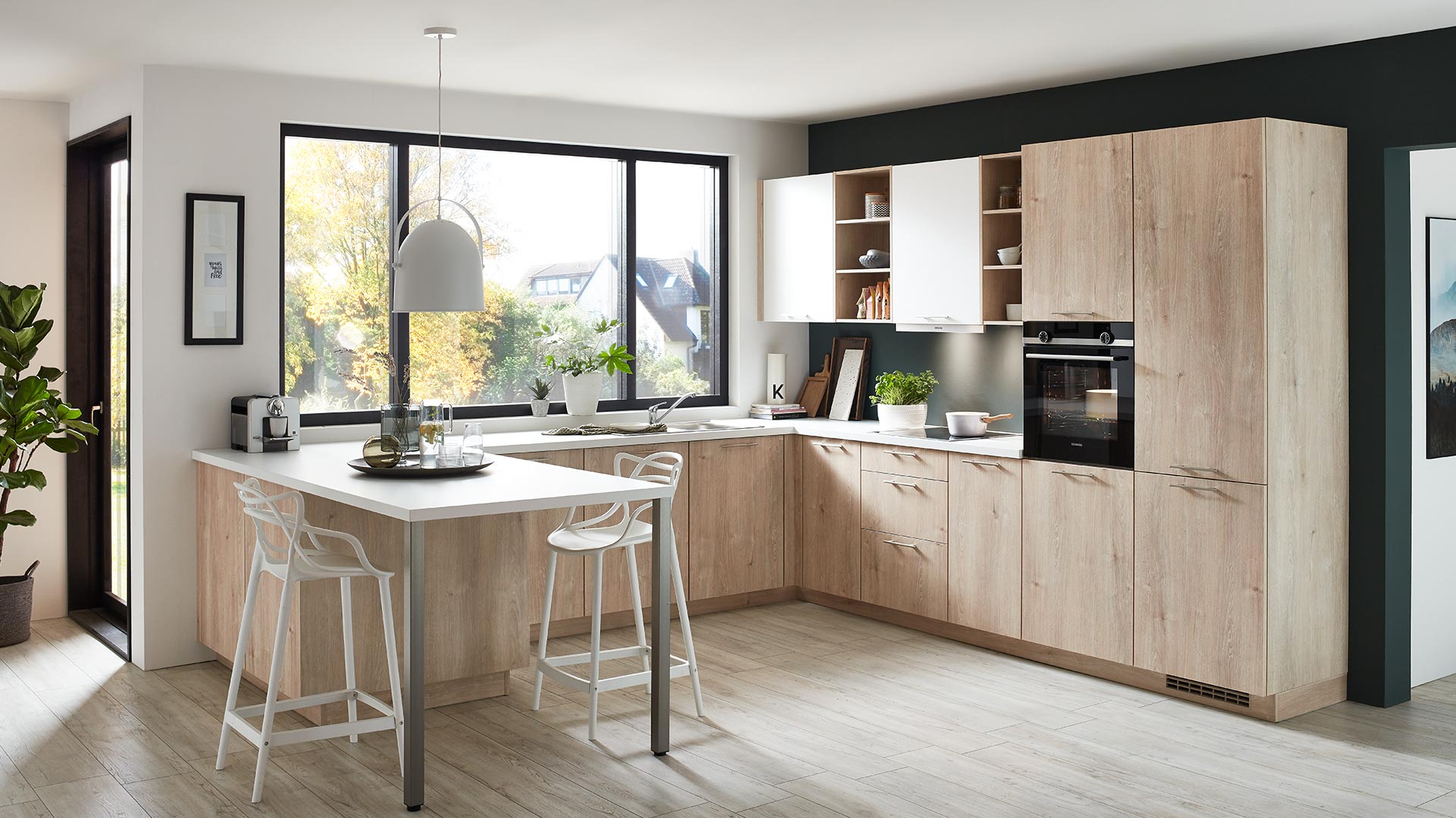Die weißen Küchenfronten in Kombination mit Regalen in heller Holzoptik und Platten-Elementen in Marmor-Struktur machen diese Küche zur Wohlfühlen-Oase. Die angesetzte Theke für 2 Sitzplätze lädt zum Verweilen ein. Extra breite Schubladen ermöglichen ein besonders großes Platzangebot.