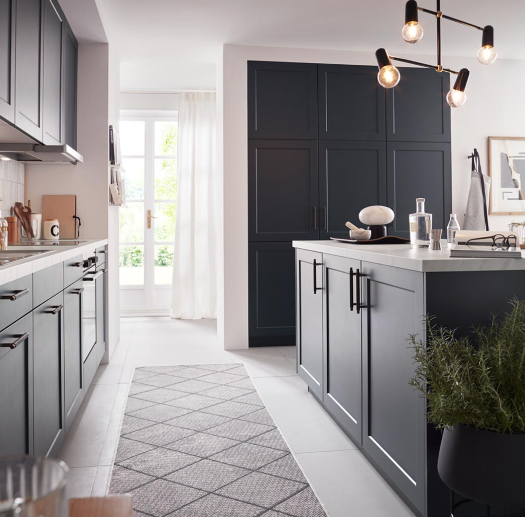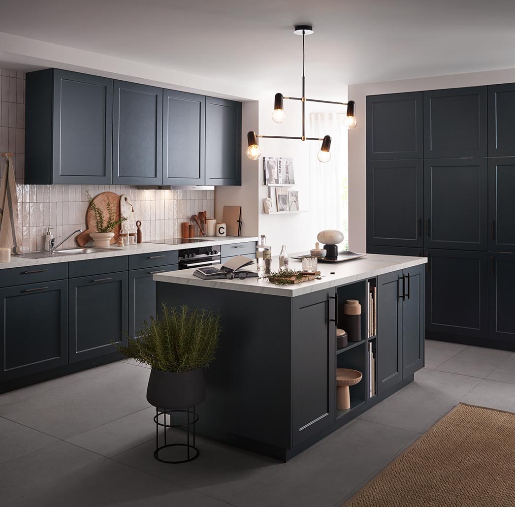 Die dezenten tiefblauen Fronten mit Rahmenfassung mit antiken Messing-Griffen vermitteln dieser Küche ein zeitlos und elegantes Design. Die hellen Arbeitsplatten lockern die Küche auf und verleihen ihr eine angenehme Leichtigkeit.!