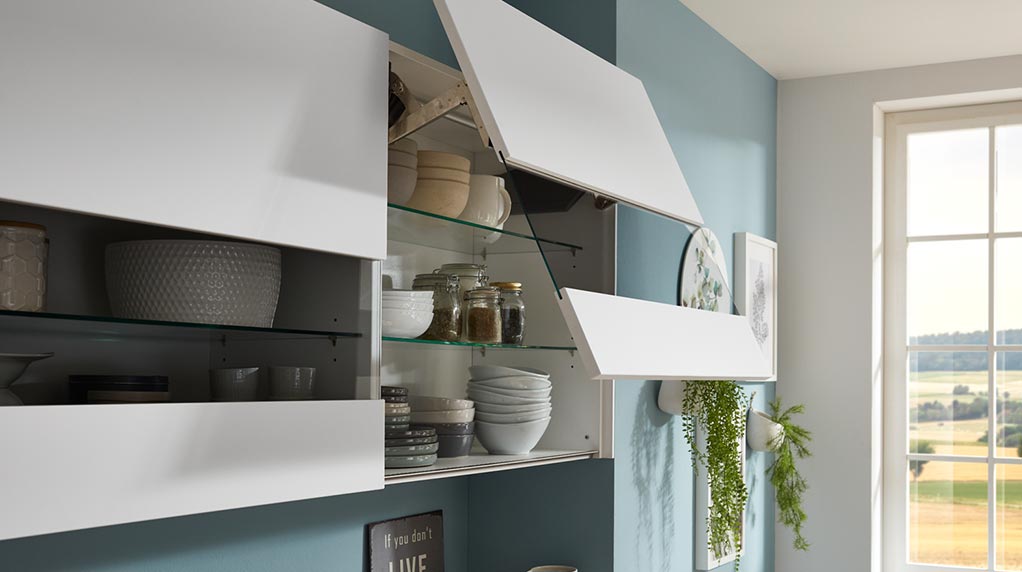 Die Schränke mit Glaselementen lassen sich nach oben öffnen.