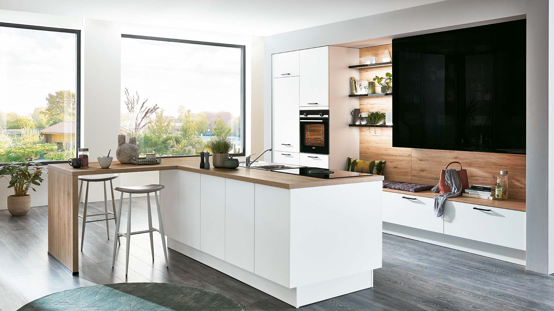 Ein angesetzter Tresen vergrößert die Arbeitsfläche und bietet zusätzliche Sitzplätze..
