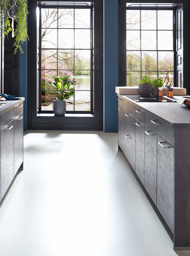 Neben dem Basismaterial Holz werden gerne Elemente aus Glas oder Edelstahl ergänzt. Beliebt sind auch die so genannten „Beton-Küchen“ - hier werden die Oberflächen der Fronten und auch Arbeitsplatten so beschichtet als seien sie aus Beton gegossen.