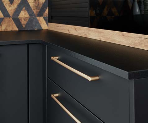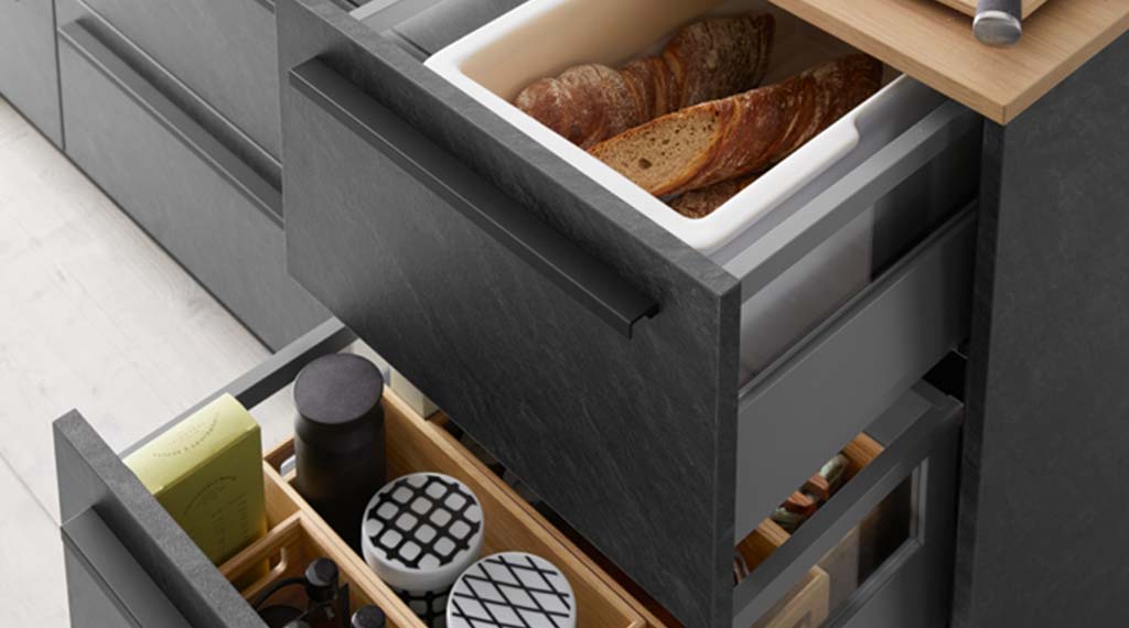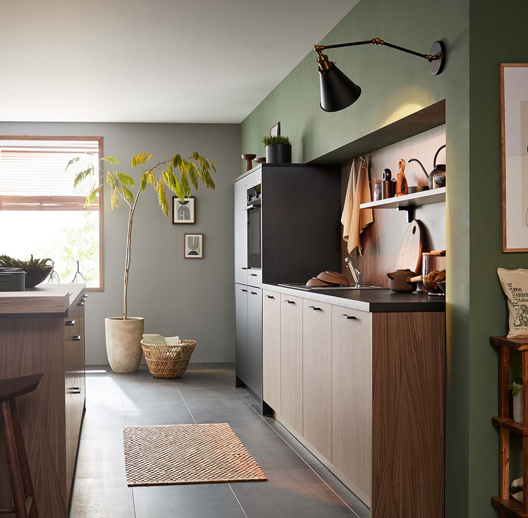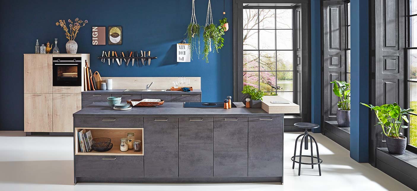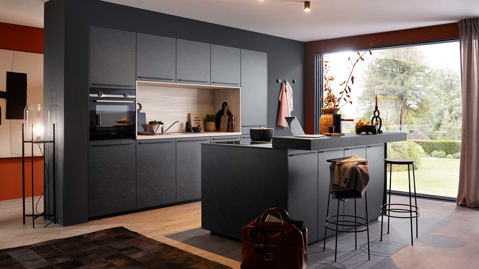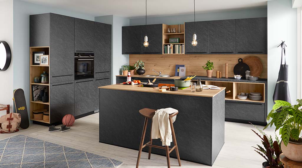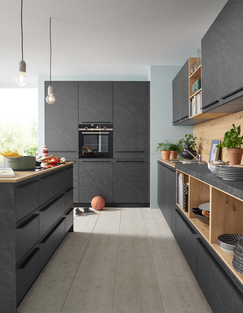 Der spannende Kontrast der Oberflächen in grauer Schieferoptik aufgelockert durch holzfarbene Elemente in Verbindung mit dezenten schwarzen Griffe geben dieser Küche eine besonderes Design.