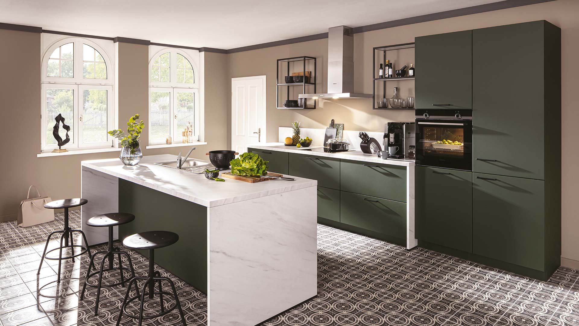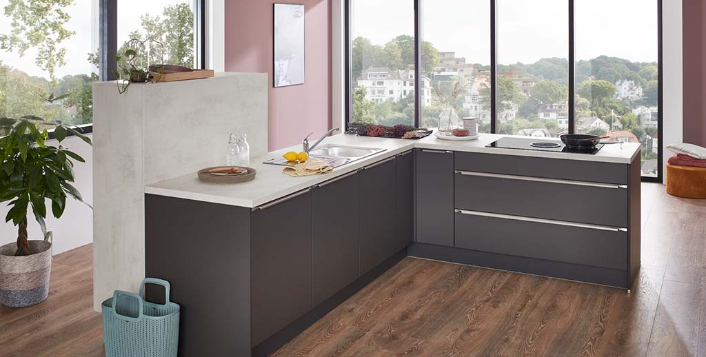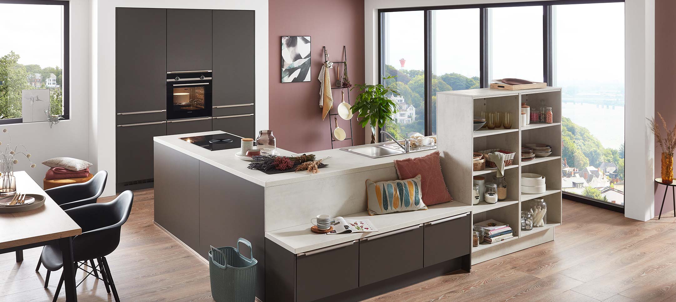 Moderne Küchen zeichnen sich durch ein zeitloses Design und eine klare Formensprache aus. Die favorisierte Farbwahl umfasst gedeckte Nuancen wie Weiß, Anthrazit, Grau, Creme oder Taupe mit ausgewählten Materialien. Zunehmend werden Griffe als Designelement dezent integriert.