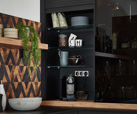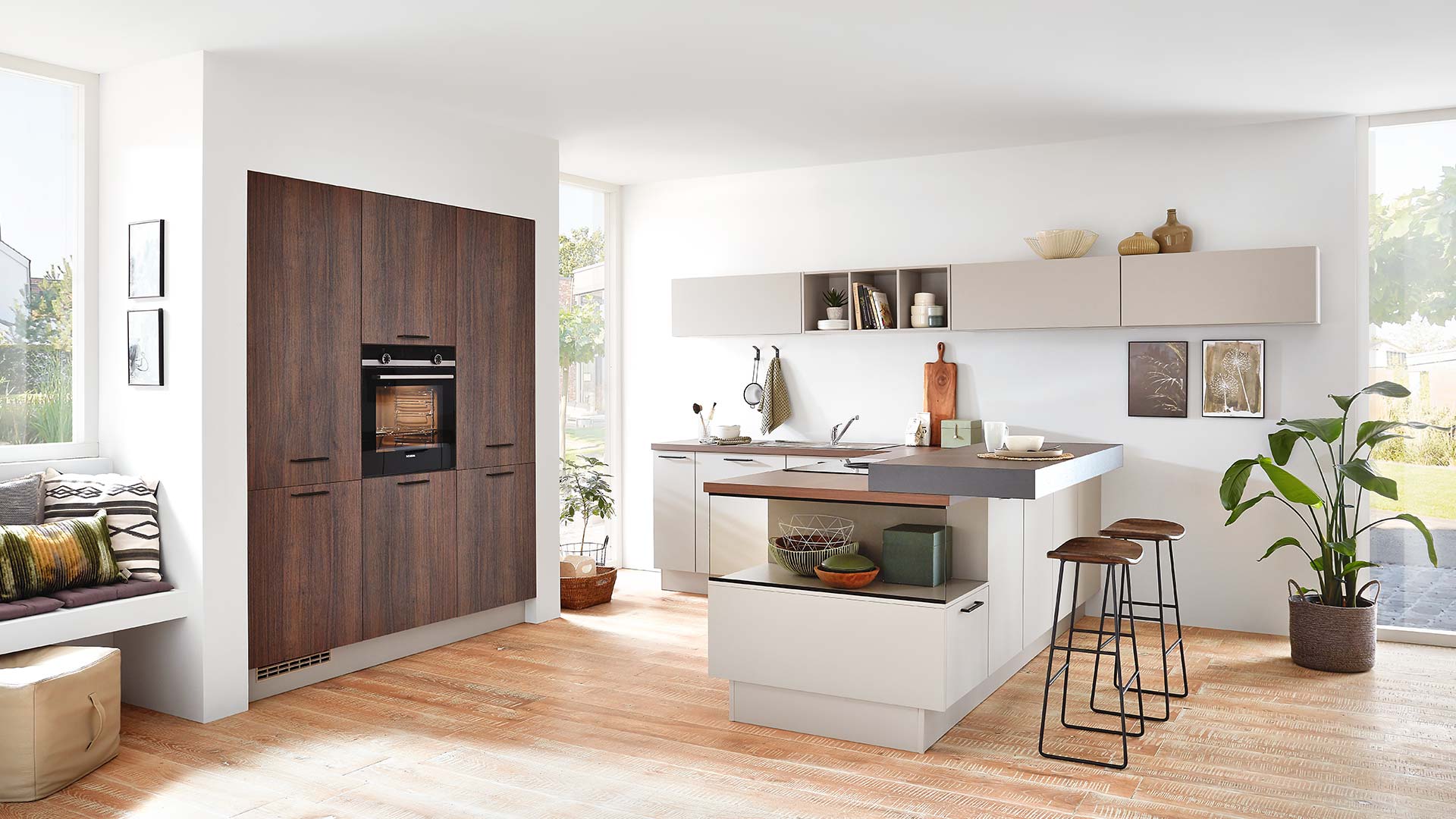 Das Design dieser Küche wird geprägt durch offene Regale in Verbindung mit einer großen Kochinsel. Schwarze Griffe und offene Regalelemente heben den holzfarbenen Charakter hervor. Optisch ein Highlight ist der hochgebaute Backofen. Der aufgesetzte Tresen rundet das wohnliche Ambiente dieser Küche ab.