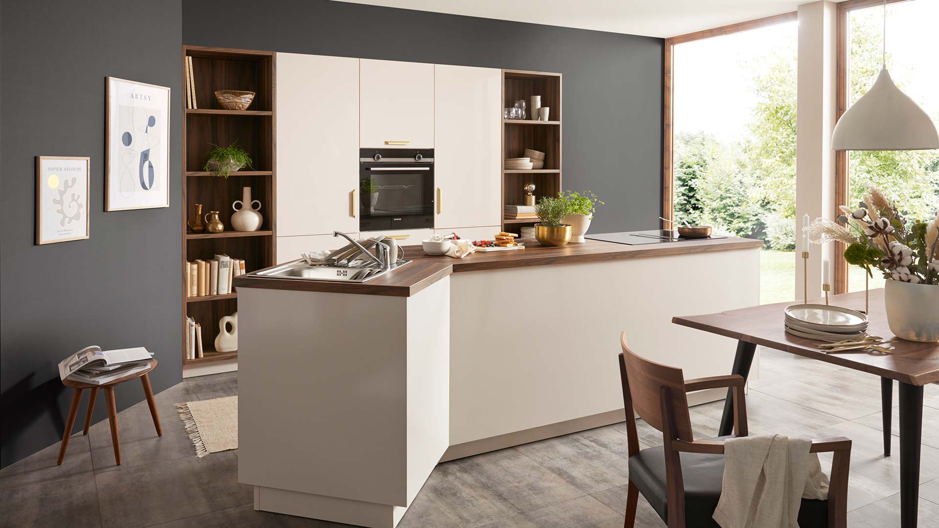 Die große Kücheninsel in L-Form in Verbindung mit offenen Regalen und Unterschränken strukturiert den Raum und bietet optimale Stauraumorganisation auf beiden Seiten. Leistungsstarke Elektrogeräte machen diese Küche zu einem funktionalen Multitalent. Wenn Gäste kommen wird diese Kücheninsel zum einladenden Treffpunkt.