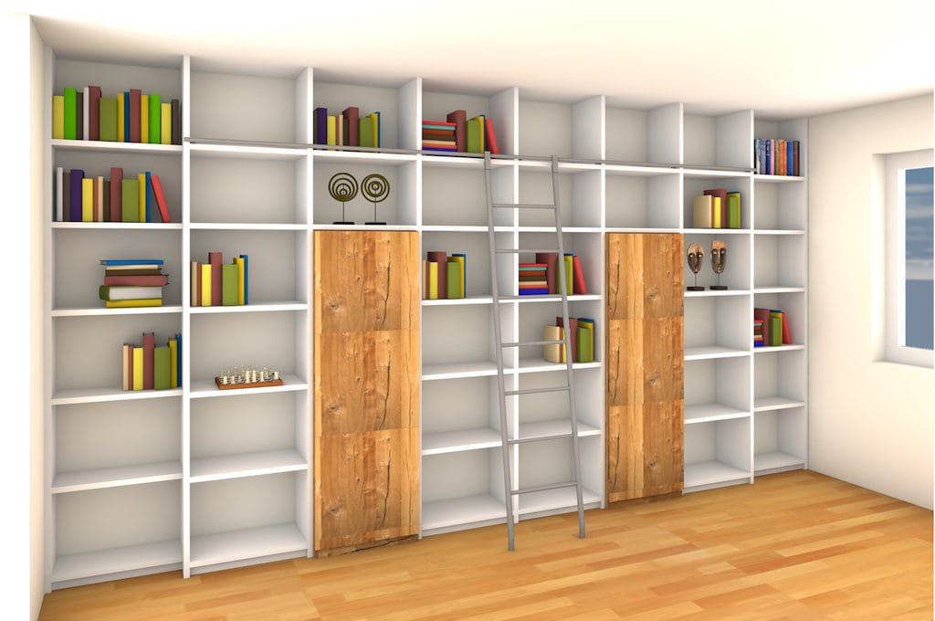 Wie hier zum Beispiel eine Bücherwand mit verschiebbarer Bibliotheksleiter, die an einer Führungsschiene verläuft.