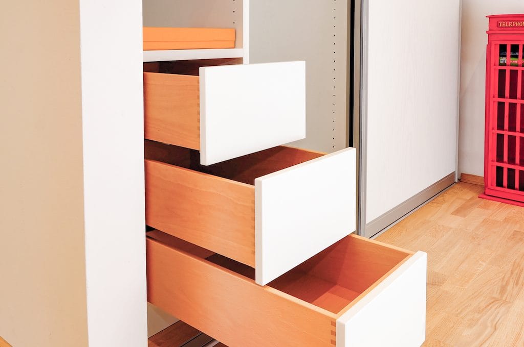 Hinter der linken Schiebetür finden sich Ablagefächer sowie 3 Schubkästen aus massivem Buchenholz für Kleinteile.